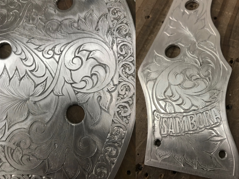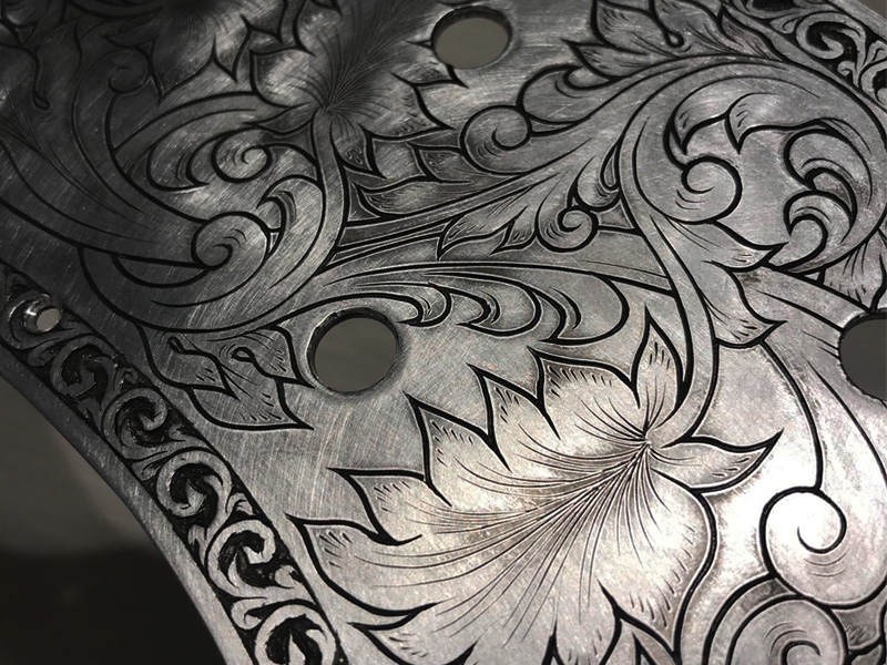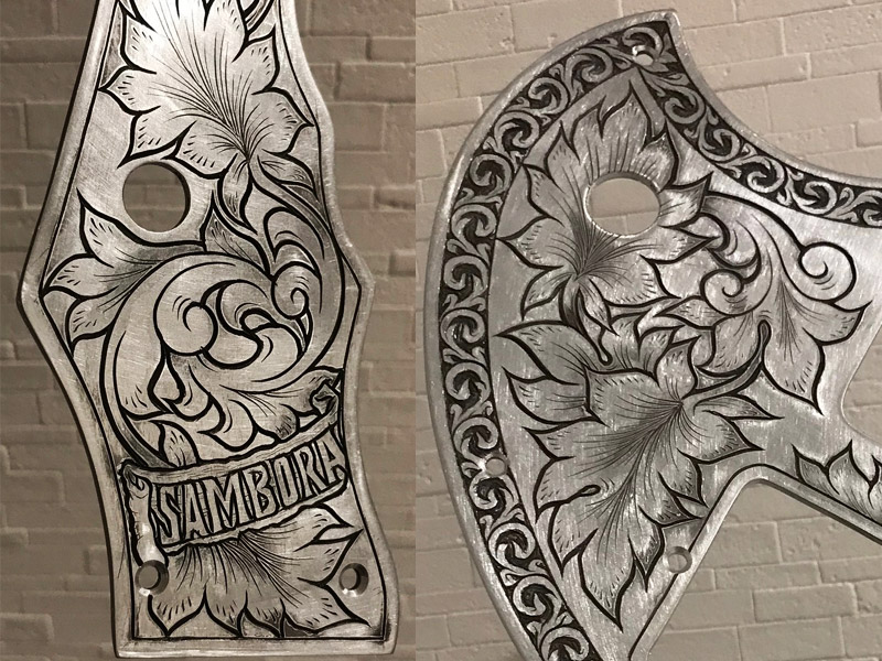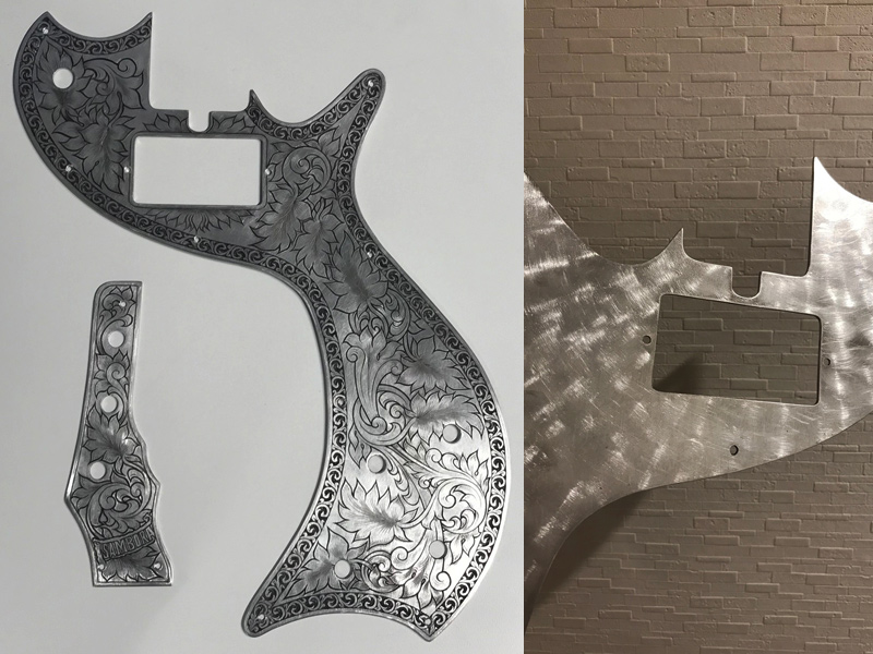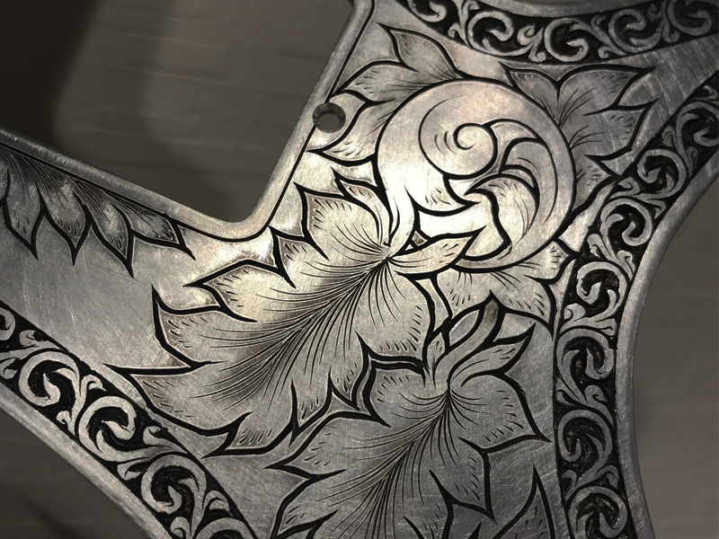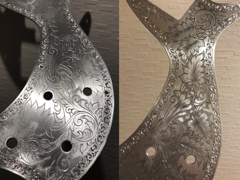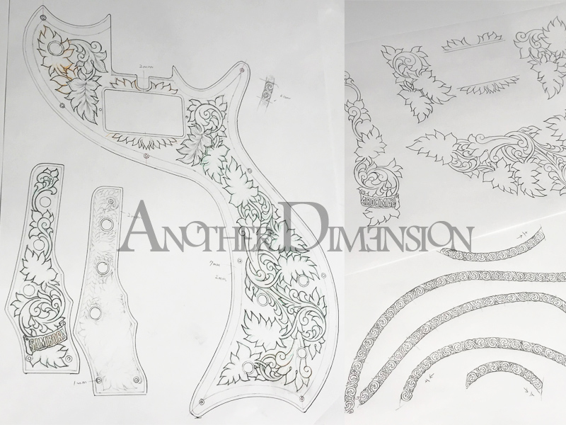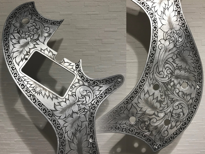 The request was for a Zemaitis-style guitar, so we kept the style (borders and leaves) in mind while adding originality to the intertwined parts.