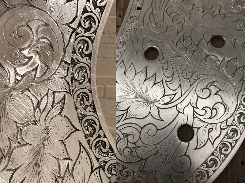The first round is for engraving the lines, the second round to shape the design, the third round to reduce the steps, the fourth round to add fine lines, and the fifth round to give it its final touches.