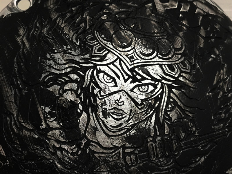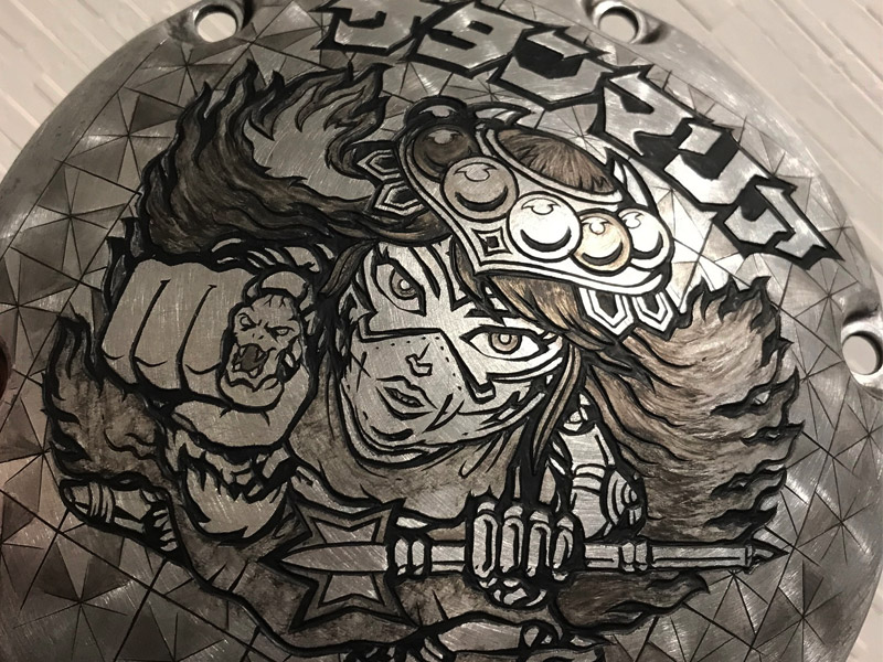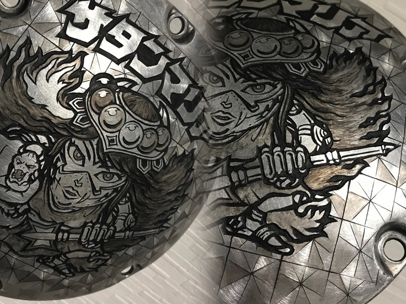 久々のハーレー ダービーカバーへ彫金です、モチーフはビックリマン「サタンマリア」、